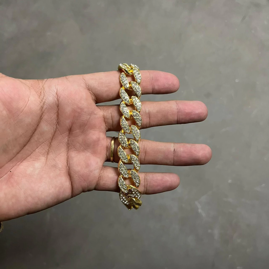 Pulseira de aço inoxidável dourado cravejada com brilhantes estilo Cuban Link. Produzidos em metal resistente, o acessório apresenta acabamento polido e estrutura rígida, indicados para compor visuais urbanos inspirados na cultura hip-hop.